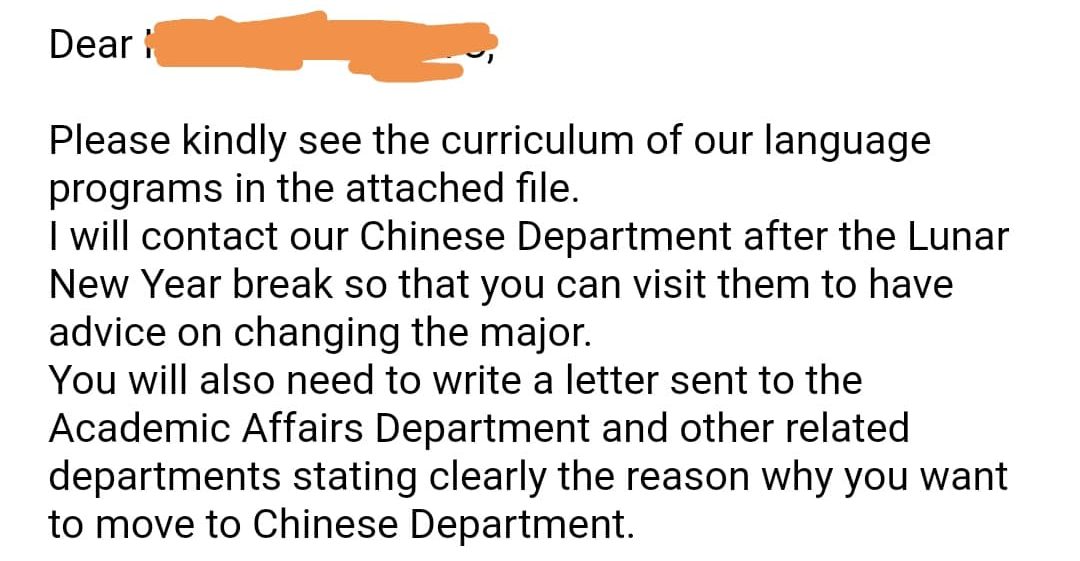 そこで今現在専攻している専攻から中国語学科に移動できるのか?事務所に行って直接聴いてみました。すると以下のようなメールが送られてきました。